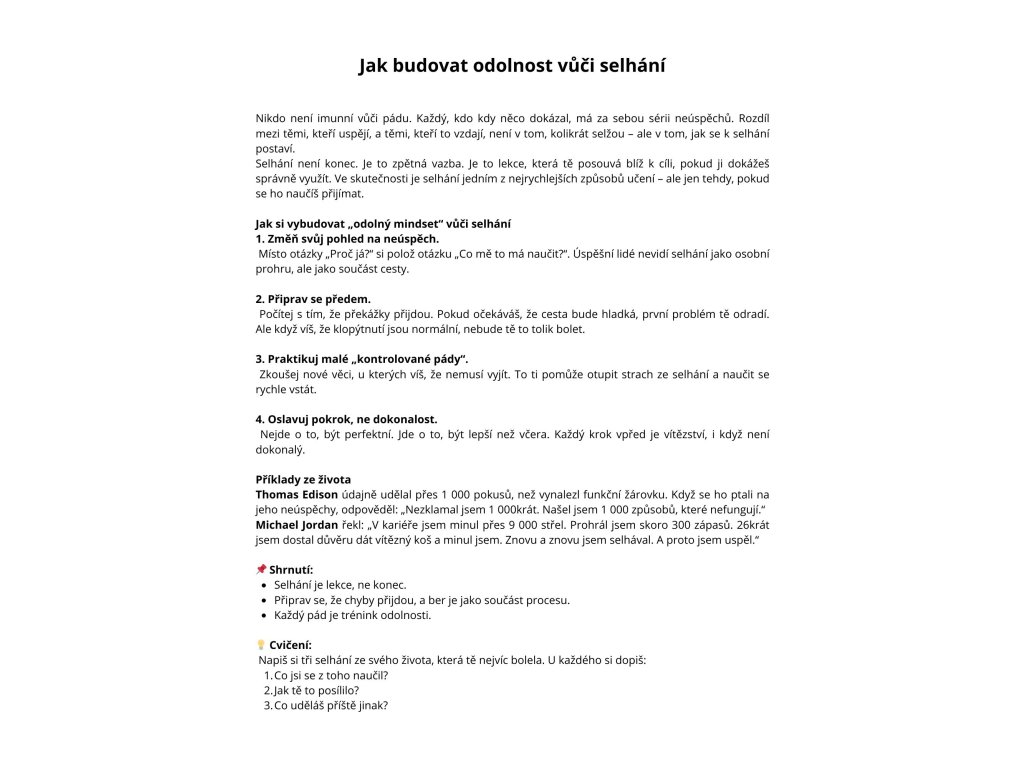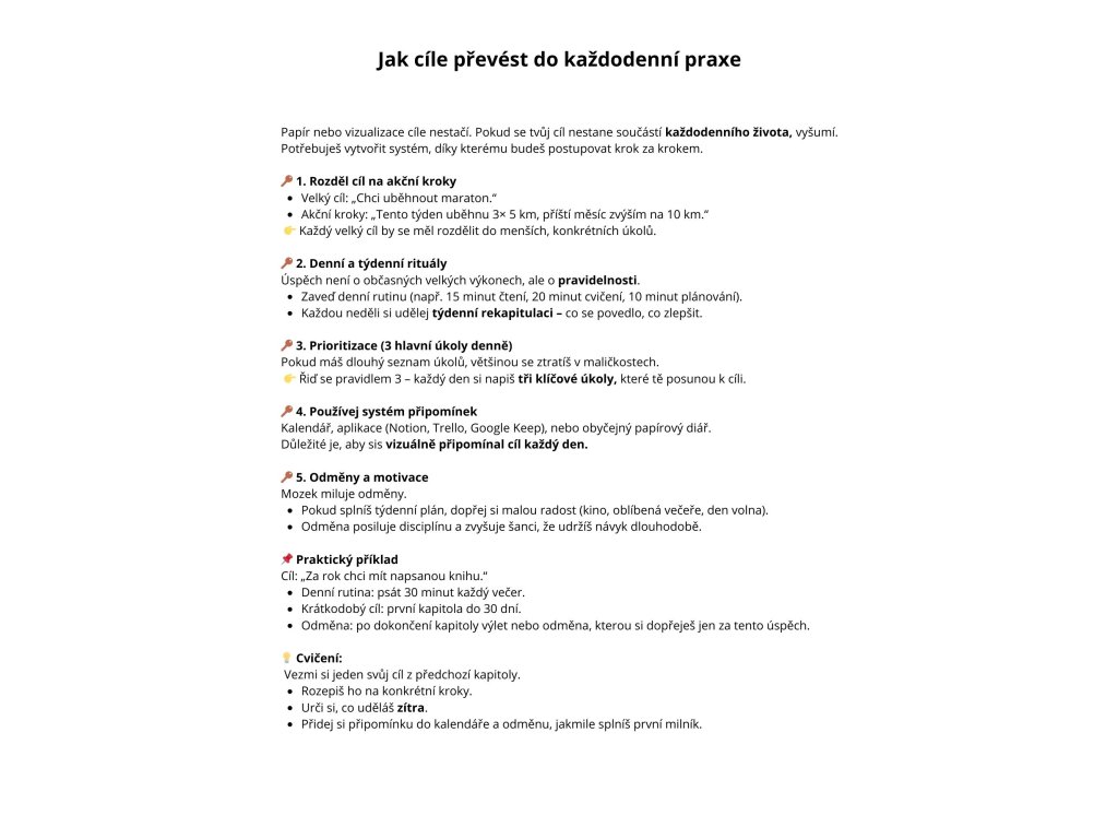 📘 Tento e-book není teorie – je to praktická příručka, která tě provede od změny mindsetu až k reálným výsledkům. Každá kapitola obsahuje příklady, cvičení a pracovní listy, aby ses posouval nejen v hlavě, ale i ve skutečném životě.