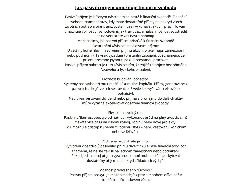 Chceš přestat vyměňovat čas za peníze? Toužíš po větší svobodě, klidu a finanční jistotě? Tento e-book tě krok za krokem naučí, jak si vytvořit pasivní příjem, který ti bude proudit na účet i ve chvíli, kdy si užíváš života.